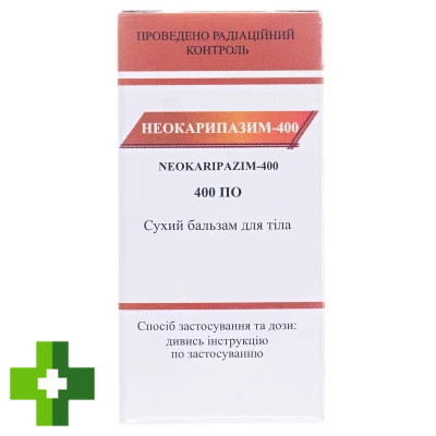 Сухий бальзам для тіла Неокаріпазім-400 являє собою комплекс протеолітичних ферментів рослинного походження, отриманих з молочного соку динного дерева (Папайя, Carica Papaya). Активними компонентами продукту є ферменти: папаїн, хімопапаіни А, хімопапаіни В, пептідази А і В, муколітичний фермент лізоцим. Завдяки протеолітичним ферментам, Неокаріпазім-400 сприяє зменшенню запальних процесів в міжхребцевих дисках, зниження тиску на нервові закінчення і зменшення больових відчуттів, сприяє прискоренню регенерації міжхребцевих дисків, покращує мікроциркуляцію і сприяє розсмоктуванню рубцевої тканини.