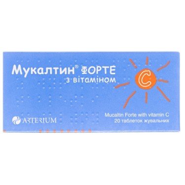 Мукалтин® Форте з вітаміном С – відхаркувальний засіб, дія якого зумовлена секретолітичними і бронхолітичними властивостями. Препарат чинить помірну протикашльову дію, зменшує кількість нападів кашлю та їх інтенсивність, збільшується кількість мокротиння та зменшує його в’язкість. Має пом’якшувальну, протизапальну та обволікаючу дію. Нормалізує змінену бронхолегеневу секрецію, покращує виділення мокротиння.
