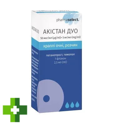 Акістан Дуо. Фармакологічних взаємодій між латанопростом та тимололом не спостерігалося, незважаючи на підвищення концентрації кислоти латанопросту у водянистій волозі майже у 2 рази після застосування комбінованого препарату порівняно з монотерапією.