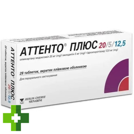 АТТЕНТО® ПЛЮС - це комбінований лікарський засіб, до складу якого входить олмесартану медоксоміл - антагоніст рецепторів ангіотензину ІІ, амлодипіну бесилат - блокатор кальцієвих каналів і гідрохлоротіазид - діуретичний засіб тіазидового ряду. Комбінація цих трьох діючих речовин виявляє синергічний ефект та сприяє зниженню артеріального тиску більшою мірою, ніж кожна діюча речовина окремо.