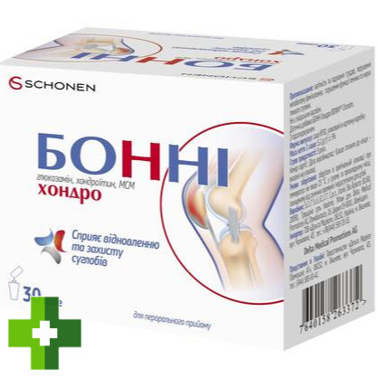 БОННІ Хондро - це додаткове джерело глікозаміногліканів - глюкозаміну сульфату, хондроїтину сульфату та природної органічної сполуки сірки - метилсульфонілметану, які здатні поліпшити функціональний стан суглобів.
