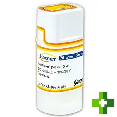 Проводилися клінічні дослідження тривалістю до 15 місяців, в яких порівнювали вплив на зниження внутрішньоочного тиску препарату КОСОПТ, що застосовувався два рази на день (певними дозами вранці та ввечері), із 0,5 % тимололом і 2,0 % дорзоламідом, що застосовувалися окремо та в комбінації, у пацієнтів із глаукомою або внутрішньоочною гіпертензією, для яких комбінована терапія вважалася доречною та необхідною в цих дослідженнях. В них були включені як неліковані пацієнти, так і пацієнти, не контрольовані належним чином монотерапією тимололом. Більшість пацієнтів отримували лікування бета-блокатором місцевого застосування як монотерапію до включення в дослідження. В аналізі комбінованих досліджень вплив препарату КОСОПТ, що застосовувався два рази на день, на зниження внутрішньоочного тиску був більшим, ніж вплив монотерапії 2 % дорзоламідом, що застосовувався три рази на день, або 0,5 % тимололом, що застосовувався два рази на день. Вплив препарату КОСОПТ, що застосовувався два рази на день, на зниження внутрішньоочного тиску був еквівалентним впливу комбінованої терапії дорзоламідом і тимололом, що застосовувалася два рази на день. Вплив препарату КОСОПТ, що застосовувався два рази на день, на зниження внутрішньоочного тиску демонструвався при вимірюванні в різні моменти часу протягом дня, і цей вплив зберігався під час довготривалого застосування.