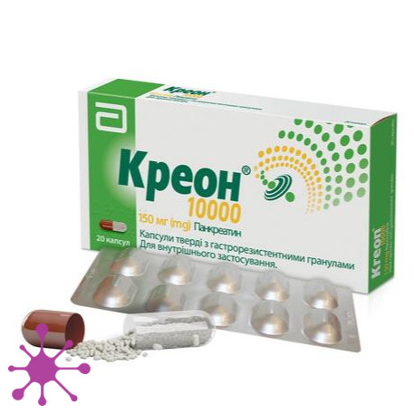 КРЕОН® 10000: 1 капсула містить 150 мг панкреатину в гастрорезистентних гранулах (Креон мінімікросфери®), які мають ферментативну активність: ліпази 10000 од. ЄФ, амілази 8000 од. ЄФ, протеази 600 од. ЄФ;